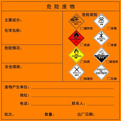 識別標簽包括粘貼式和系掛式。粘貼式危險廢物標簽粘貼于適合粘貼的危險廢物儲存容器、包裝物上,系掛式危險廢物標簽適合系掛于不易粘貼牢固或不方便粘貼但相對方便系掛的危險廢物儲存容器、包裝物上。